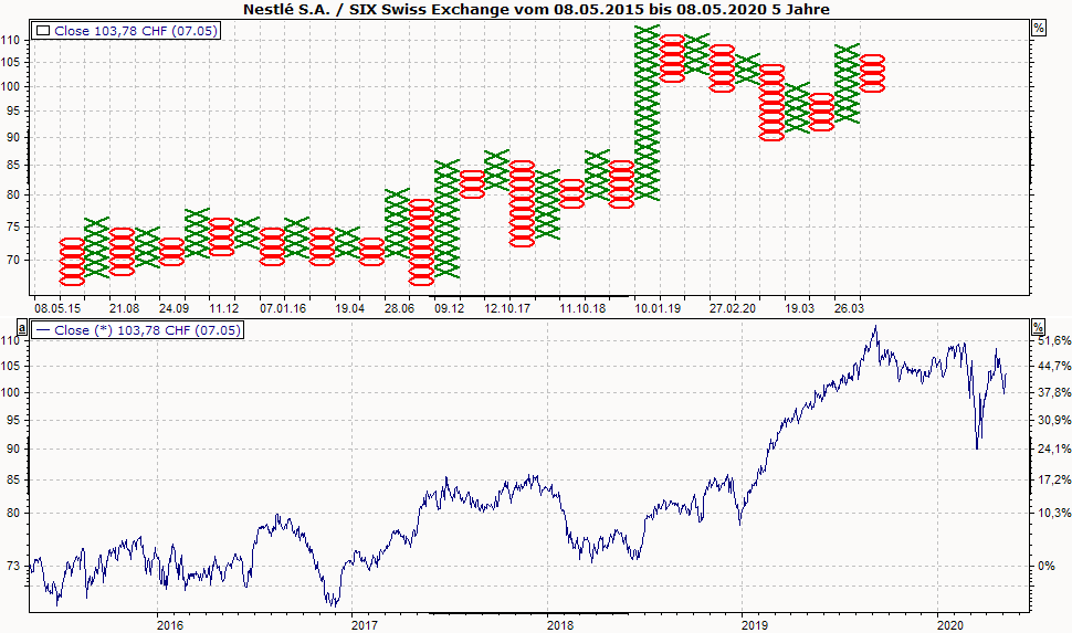 Im Gegensatz zu den Linien- und Balken-Charts zeigt der Point-and-Figure-Chart größere Trends an und ist eher für eine mittel- bis langfristige Analyse geeignet. Der Point-and-Figure-Chart ist eigentlich als Indikator zu verstehen.