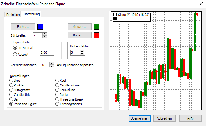 Hier unterscheiden sich die Positionen ein wenig voneinander, je nachdem, welche Chartform gewählt wurde. Die allgemeinen Positionen (Farbe, Skalenzuordnung, usw.) sind im Abschnitt Linien-Chart und allgemeine Einstellungen beschrieben, die speziellen Einstellungen für Point-and-Figure-Charts finden Sie hier.