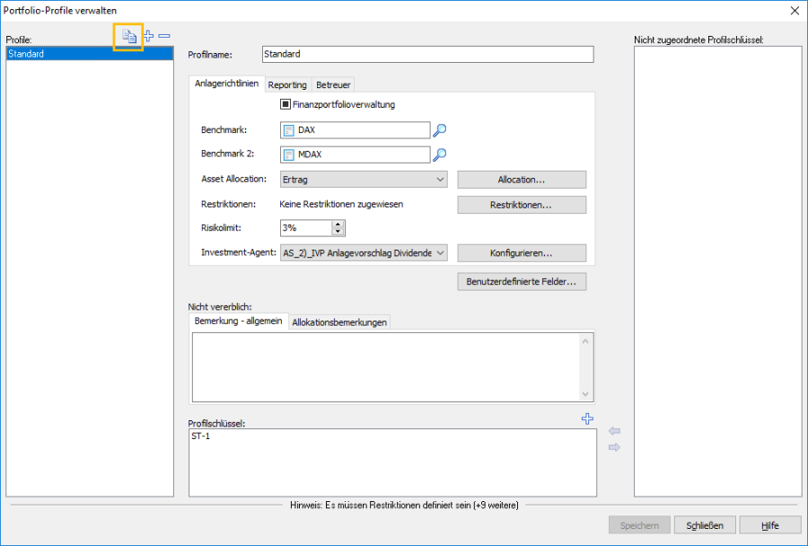 Wählen Sie das Icon "Ausgewähltes Profil kopieren". In der Liste der Portfolio-Profile erscheint ein neuer Eintrag mit der Bezeichnung "Neues Profil". Die Felder sind mit den Werten des Ausgangsprofils bereits vorbelegt.