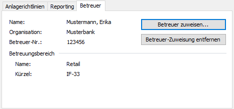 - Im erscheinenden Dialogfenster "Betreuer verwalten" können Sie einen anderen Betreuer auswählen. Sie können auch den aktuell zugewiesenen Betreuer bearbeiten.