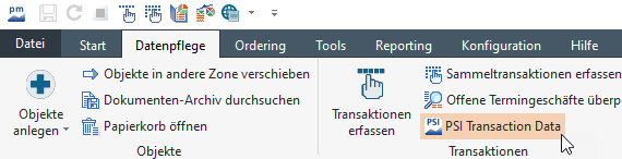 Setzen Sie ein PSI Transaction Data ein, dann haben Sie die Möglichkeit, dieses direkt aus dem Infront Portfolio Manager heraus zu starten. Wählen Sie dazu auf der Registerkarte "Datenpflege" den Befehl PSI TRANSACTION DATA.
