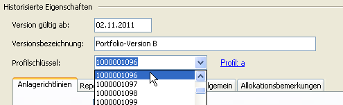 - Wählen Sie dann in der Auswahlliste "Profilschlüssel" den gewünschten Profilschlüssel aus. Ist dieser Profilschlüssel einem Portfolio-Profil zugewiesen, so erscheint neben der Auswahlliste der Name des Portfolio-Profils.