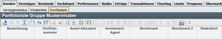 Für Gruppen und Inhaber können Sie mithilfe der Portfolioliste alle zugehörigen Portfolios und deren Stammdaten auflisten. Die Portfolioliste finden Sie z. B. im Workspace von Gruppen unter dem Worksheet "Kunden":