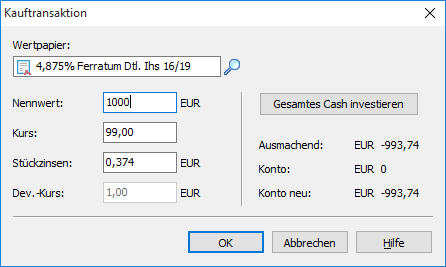 Bestätigen Sie danach Ihre Eingaben mit "OK". Die gekaufte Anleihe erscheint nun in der Portfolioansicht.