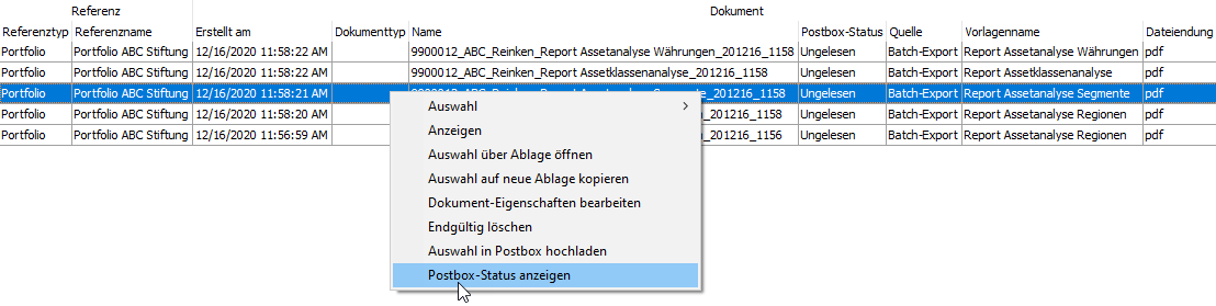 - Wählen Sie im Kontextmenü des Dokuments in der Liste den Befehl POSTBOX-STATUS ANZEIGEN. (Dieser Befehl ist nur in sinnvollen Fällen sichtbar.)