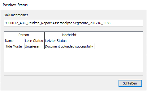 Im erscheinenden Dialogfenster "Postbox-Status" werden die Status für alle relevanten Personen für dieses Dokument in einer Tabelle aufgelistet.