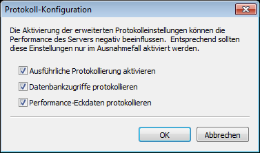 Über den Befehl PROTOKOLLIERUNG KONFIGURIEREN im Hauptmenü öffnen Sie das Dialogfenster "Protokoll-Konfiguration", in dem sich die Logging-Einstellungen des Servers zur Laufzeit beeinflussen lassen. Dadurch lassen sich z. B. zu Analysezwecken mehr Daten sammeln. Die Daten werden – mit Ausnahme der Performance-Daten – in den üblichen Log-Dateien mitprotokolliert.
