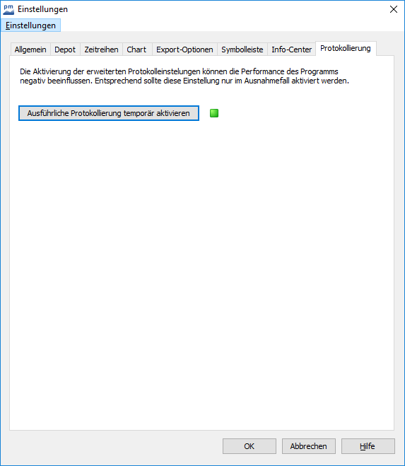 Die Kontrollleuchte wechselt von "Rot" auf "Grün", das Protokoll wird erweitert. Diese Einstellung können Sie analog wieder zurücksetzen. Beim Beenden des Infront Portfolio Manager wird automatisch wieder auf die "normale" Protokollierung umgeschaltet.