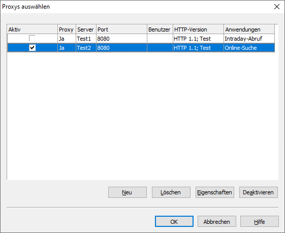 Button "Aktivieren" | Wählen Sie diesen Button, um den aktuell markierten Proxy zu aktivieren bzw. zu deaktivieren. Den aktiven Proxy erkennen Sie am aktivierten Kontrollkästchen in der Spalte "Aktiv". |