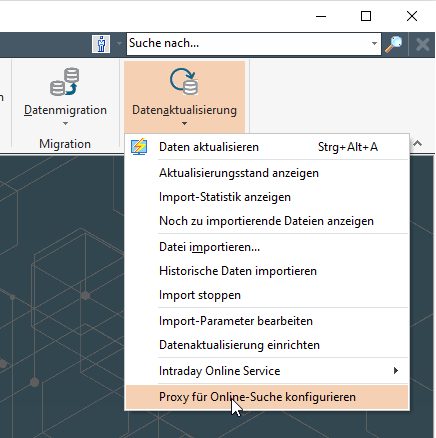 - Wählen Sie im Menüband des Infront Portfolio Manager auf der Registerkarte "Datenpflege" im Menü des Icons "Datenaktualisierung" den Befehl PROXY FÜR ONLINE-SUCHE KONFIGURIEREN.