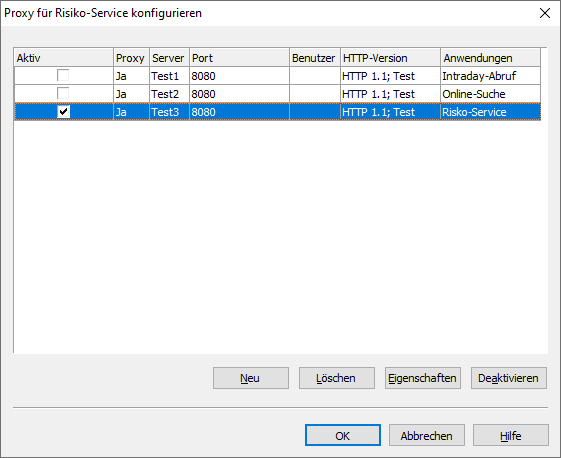 Button "Aktivieren" bzw. "Deaktivieren" | Wählen Sie diesen Button, um den aktuell markierten Proxy zu aktivieren bzw. zu deaktivieren. Den aktiven Proxy erkennen am aktivierten Kontrollkästchen in der Spalte "Aktiv". |