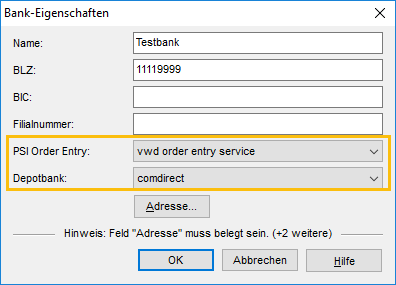 - Öffnen Sie wie im Abschnitt Bankverbindungen anlegen beschrieben das Dialogfenster "Bank-Eigenschaften" der Bank.