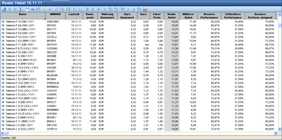 Realer Hebel | Der Reale Hebel gibt an, wie sich der Optionsschein im Analyse-Zeitraum durchschnittlich im Vergleich zum Basiswert entwickelt hat. Ist der reale Hebel größer als eins, bedeutet das, dass der Optionsschein besser gelaufen ist als die zugehörige Aktie. |