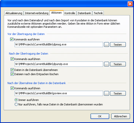 Im Infront Portfolio Manager haben Sie die Möglichkeit, vor und nach dem Datenabruf sowie nach dem Datenimport zusätzliche externe Aktionen anzustoßen. Eine Aktion lässt sich in Form einer üblichen Kommandozeile mit optionalen Parametern angeben.