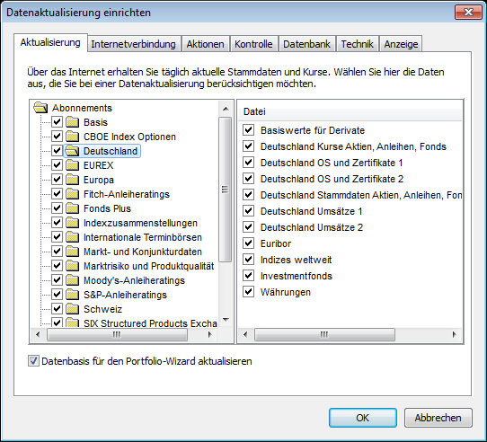 Hier sind nicht abonnierte Daten auf der linken Seite nicht anwählbar. Wählen Sie ggf. aus, welche Ihrer abonnierten Daten Sie abrufen bzw. nicht abrufen möchten. Standardmäßig sind alle zu den abonnierten Abos gehörenden Daten aktiviert. Deaktivieren oder aktivieren Sie ggf. auf der rechten Seite die gewünschten Bestandteile. Alle mit einem Häkchen markierten Bestandteile eines Abonnements werden beim nächsten Download abgerufen. - Bestätigen Sie die Einstellungen auf der Registerkarte "Aktualisierung" mit "OK".