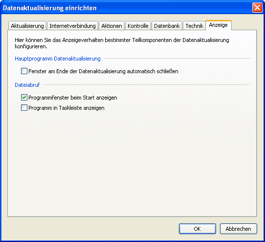 Fenster am Ende der Datenaktualisierung automatisch schließen | Aktivieren Sie dieses Kontrollkästchen, um das Hauptfenster direkt nach erfolgtem Abruf der Daten automatisch zu schließen. |