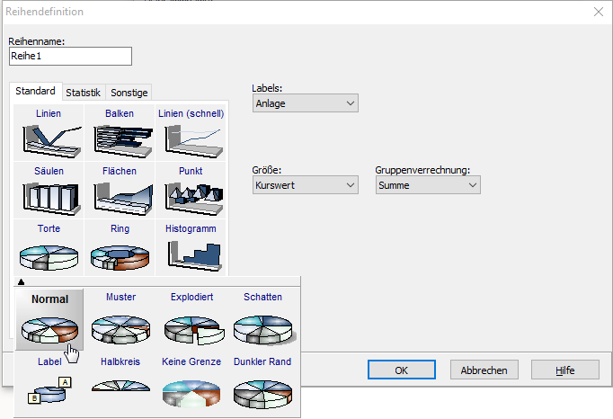 Das Dialogfenster "Reihendefinition" wird geöffnet. - Wählen Sie aus der Galerie eine Darstellungsart aus. Die verfügbaren Arten sind in die Kategorien "Standard", "Statistik" und "Sonstige" gegliedert.