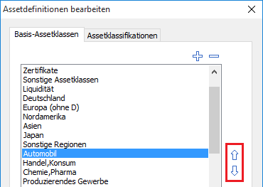 - Klicken Sie auf den nach oben zeigenden Pfeil, wenn Sie die Basis-Assetklasse nach oben verschieben möchten. Klicken Sie auf den nach unten zeigenden Pfeil, wenn Sie die Basis-Assetklasse nach unten verschieben möchten.