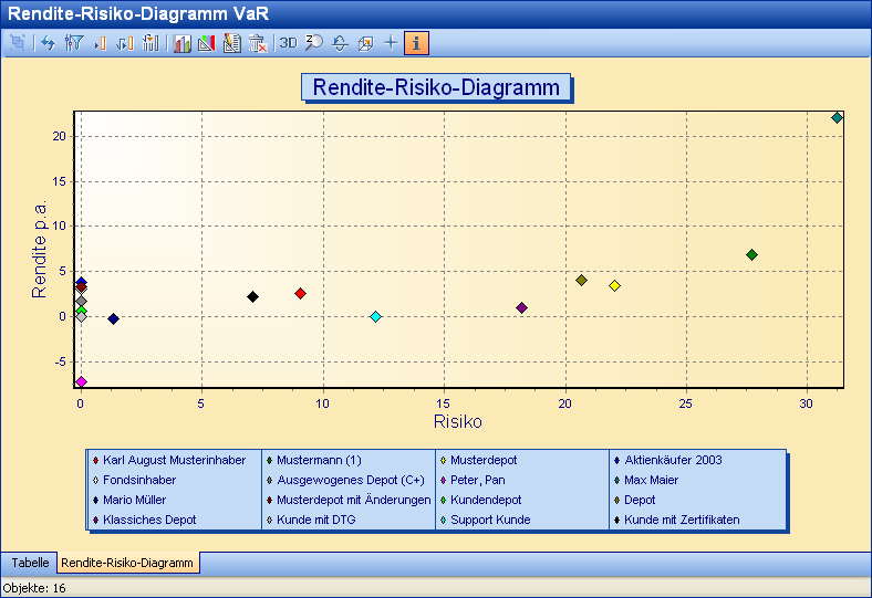 Diese Auswertung ist analog zum Rendite-Risiko-Diagramm aufgebaut, nur dass das Risiko hier statt durch die Volatilität mit dem VaR gemessen wird. Der VaR wird berechnet, indem das Portfolio als Fonds betrachtet wird.