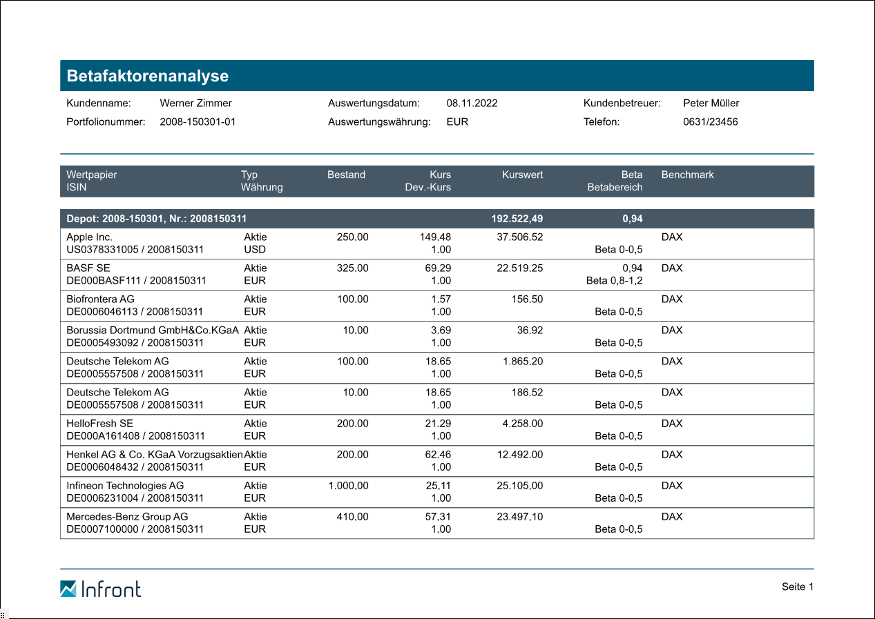 Der "Report Betafaktoranalyse" stützt sich auf die Informationen und Parameter der gleichnamigen Depotauswertung. Details zu den einzelnen Spalten finden Sie daher im Kapitel Betafaktoranalyse.