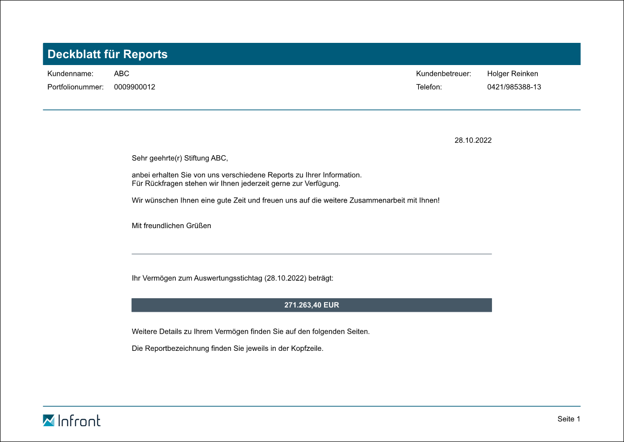 Nutzen Sie den "Report Deckblatt" als erste Seite eines professionellen Kundenreportings (z. B. in Ihren Reportmappen). Ein standardisiertes Anschreiben ist integriert, bereits hier erhält der Kunde die wichtigste Information, die Gesamtsumme seines Vermögens.