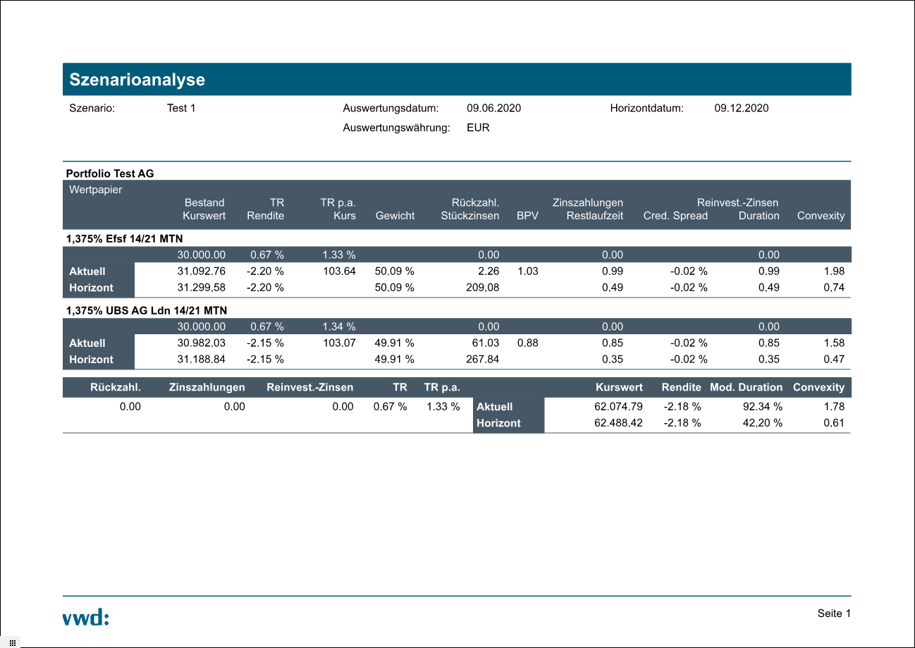 Wie es der Name vermuten lässt, liefert Ihnen der "Report Detailübersicht Szenario Erweitert" zusätzlich zu den Kennzahlen aus dem "Report Detailübersicht Szenario" weitere Daten wie Stückzinsen, BPV, Restlaufzeit oder Credit Spreads. Lesen Sie zu den einzelnen Kennzahlen ggf. den Abschnitt Szenario Portfolioübersicht.