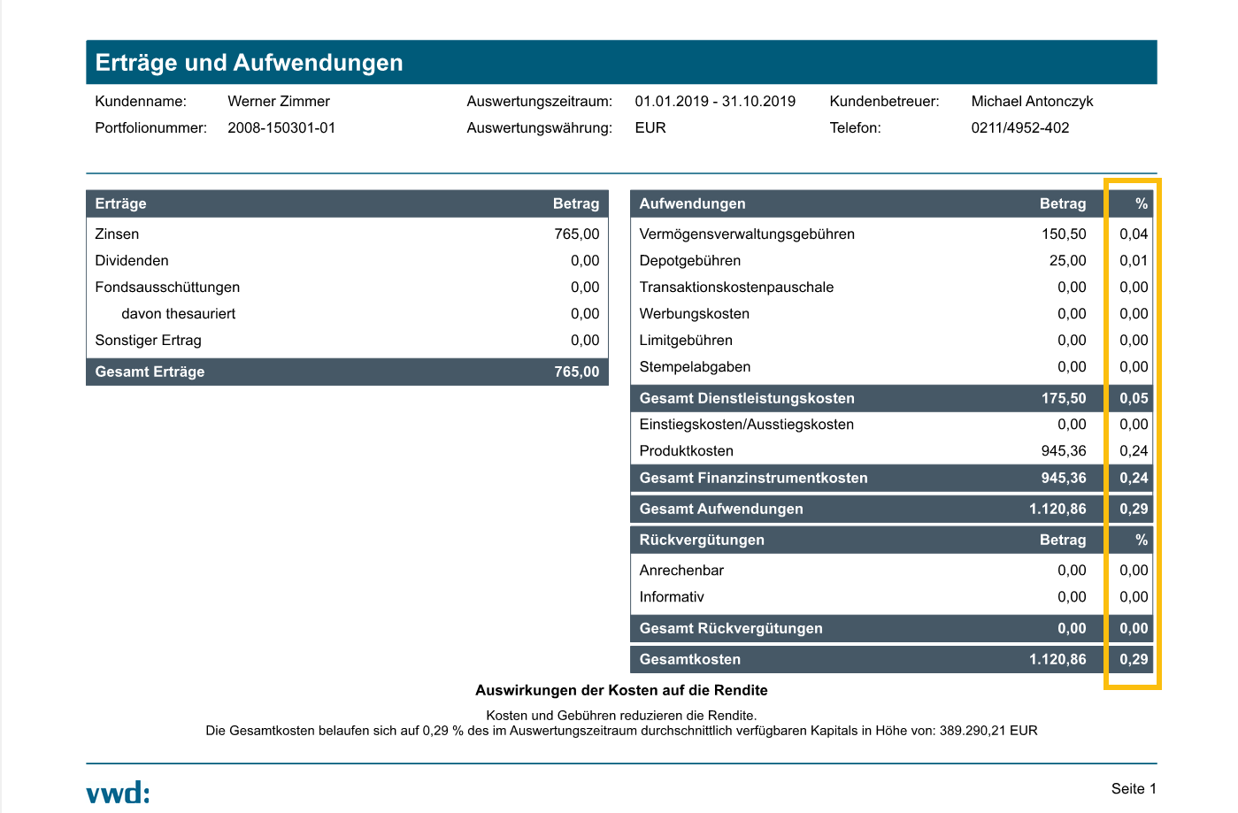 Der Report wird neu berechnet und die Spalte mit den prozentualen Kosten wird eingeblendet. Auch der Text im unteren Bereich "Auswirkungen der Kosten auf die Rendite" wird entsprechend aktualisiert.