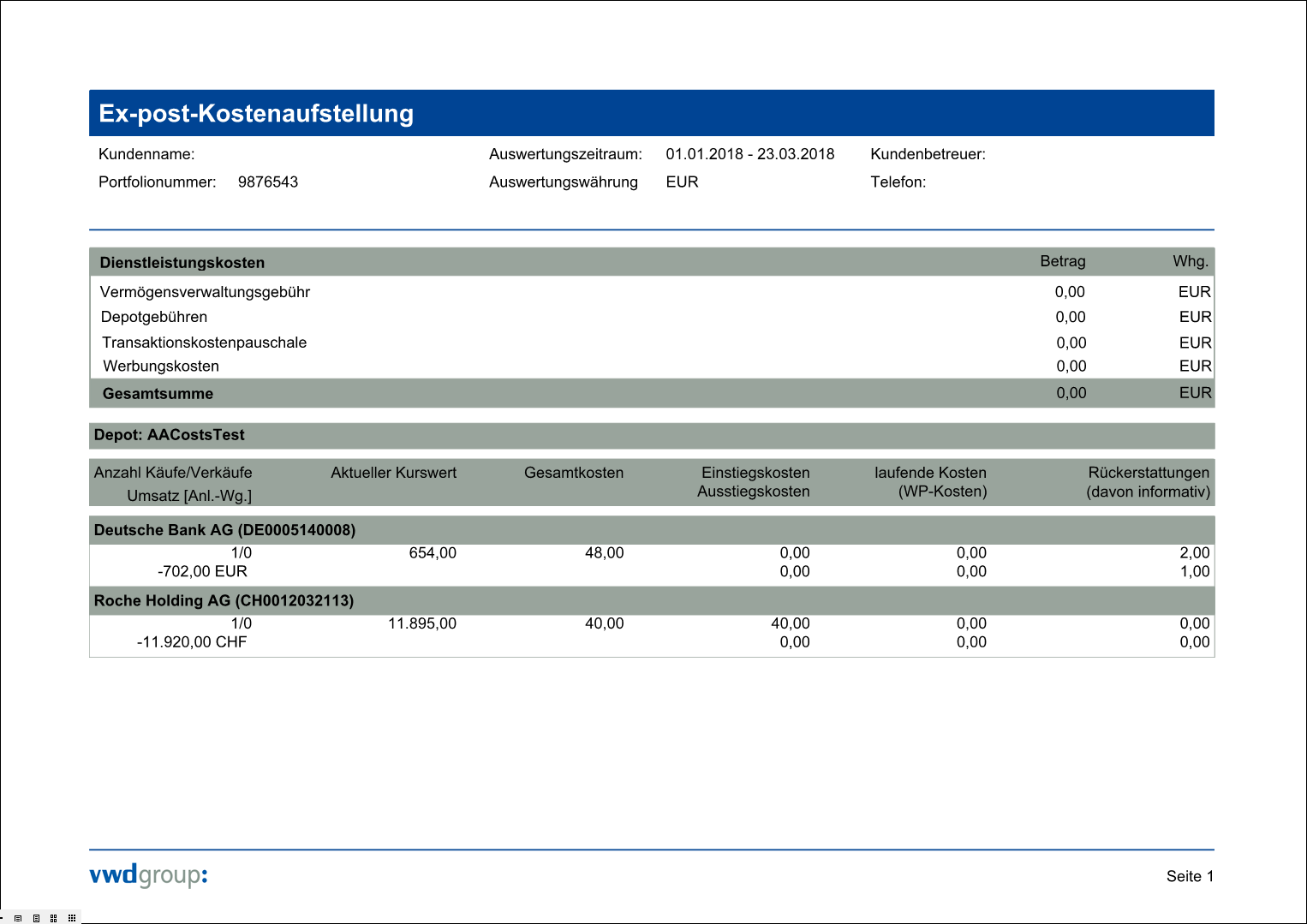 Dieser Report stellt Ihnen einen detaillierten Überblick der Ex-post-Kosten aller Transaktionen des Inhabers zur Verfügung. Neben der übersichtlichen Darstellung der angefallenen Dienstleistungskosten folgt eine detaillierte Auflistung der Kosten aller Wertpapiertransaktionen der enthaltenen Depots. Auch Transaktionen vor Einführung des Kostenservices werden berücksichtigt.