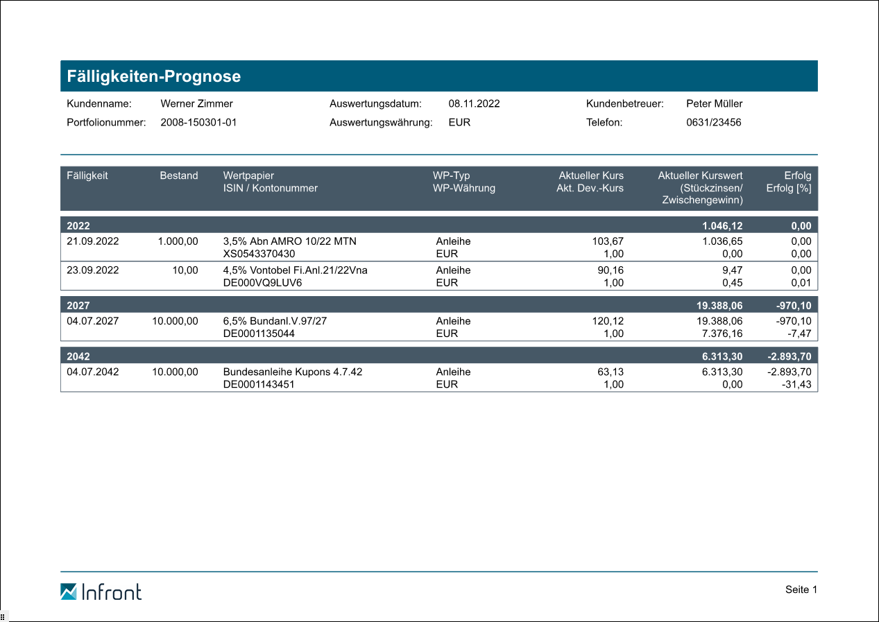 Neben dem Report steht in Ihrem Infront Portfolio Manager auch eine tabellarische Fälligkeiten-Prognose zur Verfügung.