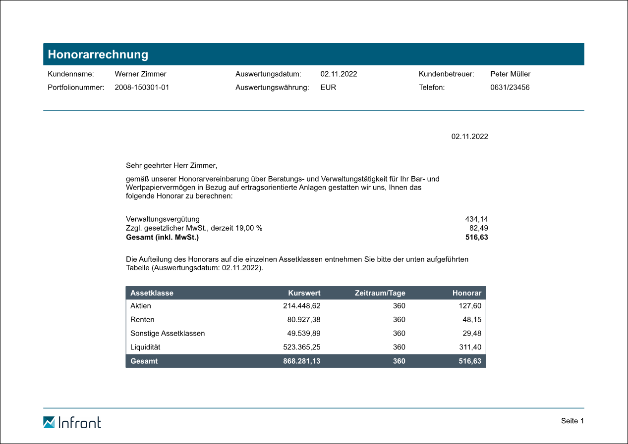 Nutzen Sie den "Report Honorarrechnung" als Muster für Kundenrechnungen. In der Tabelle ist die Aufteilung des Honorars auf die verschiedenen Assetklassen dargestellt.