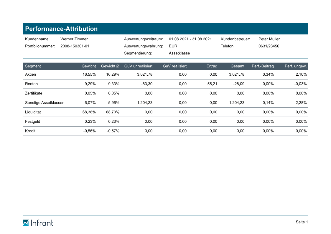 Der Report "Performance-Attribution" liefert neben der Berechnung der Performancebeiträge auch eine Aufteilung auf die einzelnen Segmente, deren Gewicht und GuV-Beitrag. Auch die Besonderen Anlagen - Kredite, Devisentermingeschäfte, Margins und Festgelder – werden im "Report Performance-Attribution" berücksichtigt.