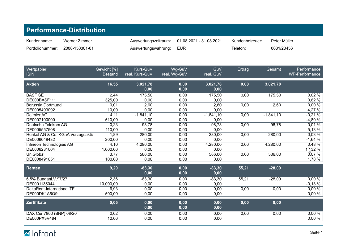 Ein weiterer Report im Bereich der Performance-Attribution neben dem "Report Performance-Attribution" ist der "Report Performance-Distribution". Sie finden diesen z. B. im Workspace eines Inhabers oder Portfolios auf dem Worksheet "Reporting", "Performance".