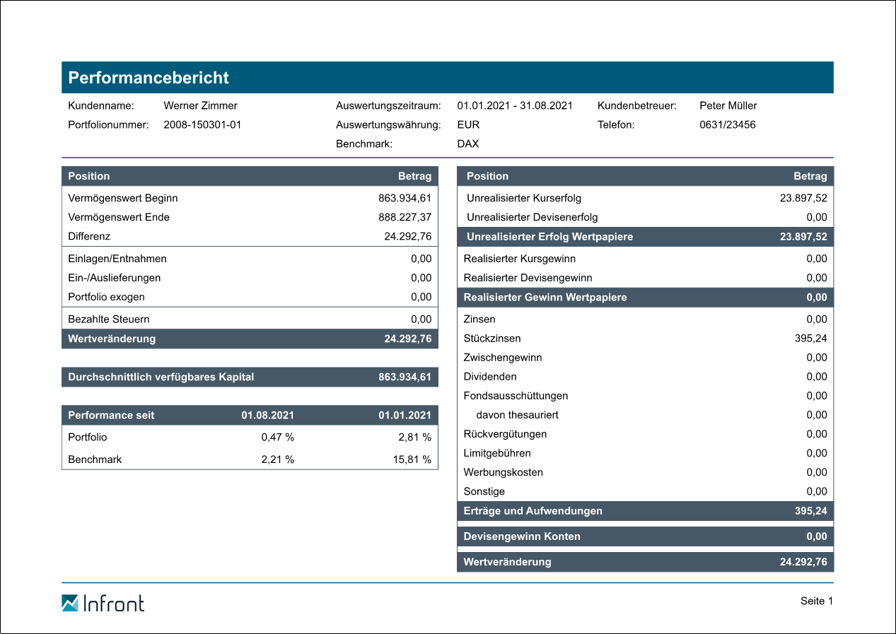 Der "Report Performancebericht" bietet einen guten Überblick über die Vermögensveränderung eines Kunden in einem bestimmten Zeitraum. Er beschreibt den Vermögensstand zu Beginn und zum Ende eines Zeitraums sowie die absolute und prozentuale Performance.