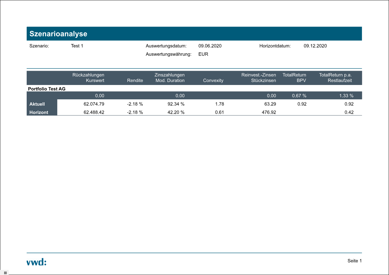 Der "Report Portfolioübersicht Szenarien Erweitert" liefert zusätzlich zu den Kennzahlen aus dem "Report Portfolioübersicht Szenarien" weitere Daten zu allen Portfoliovarianten wie Stückzinsen, BPV oder Restlaufzeit oder Credit Spreads. Lesen Sie zu den einzelnen Kennzahlen ggf. den Abschnitt Szenario Portfolioübersicht.
