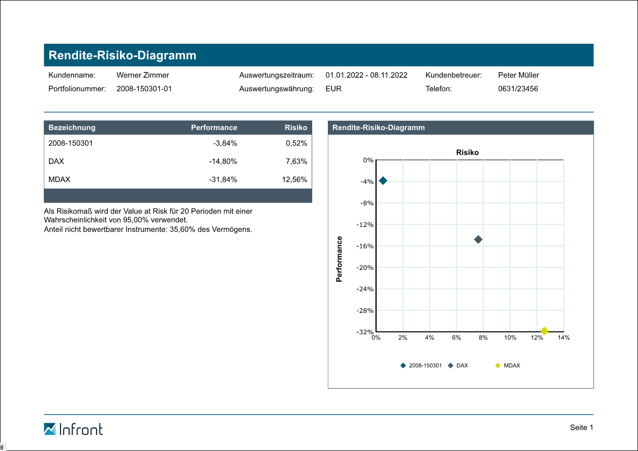 Sie finden den "Report Rendite-Risiko-Diagramm" im Auslieferungszustand im Workspace von Inhabern und Portfolios auf dem Worksheet "Reporting", "Risiko".