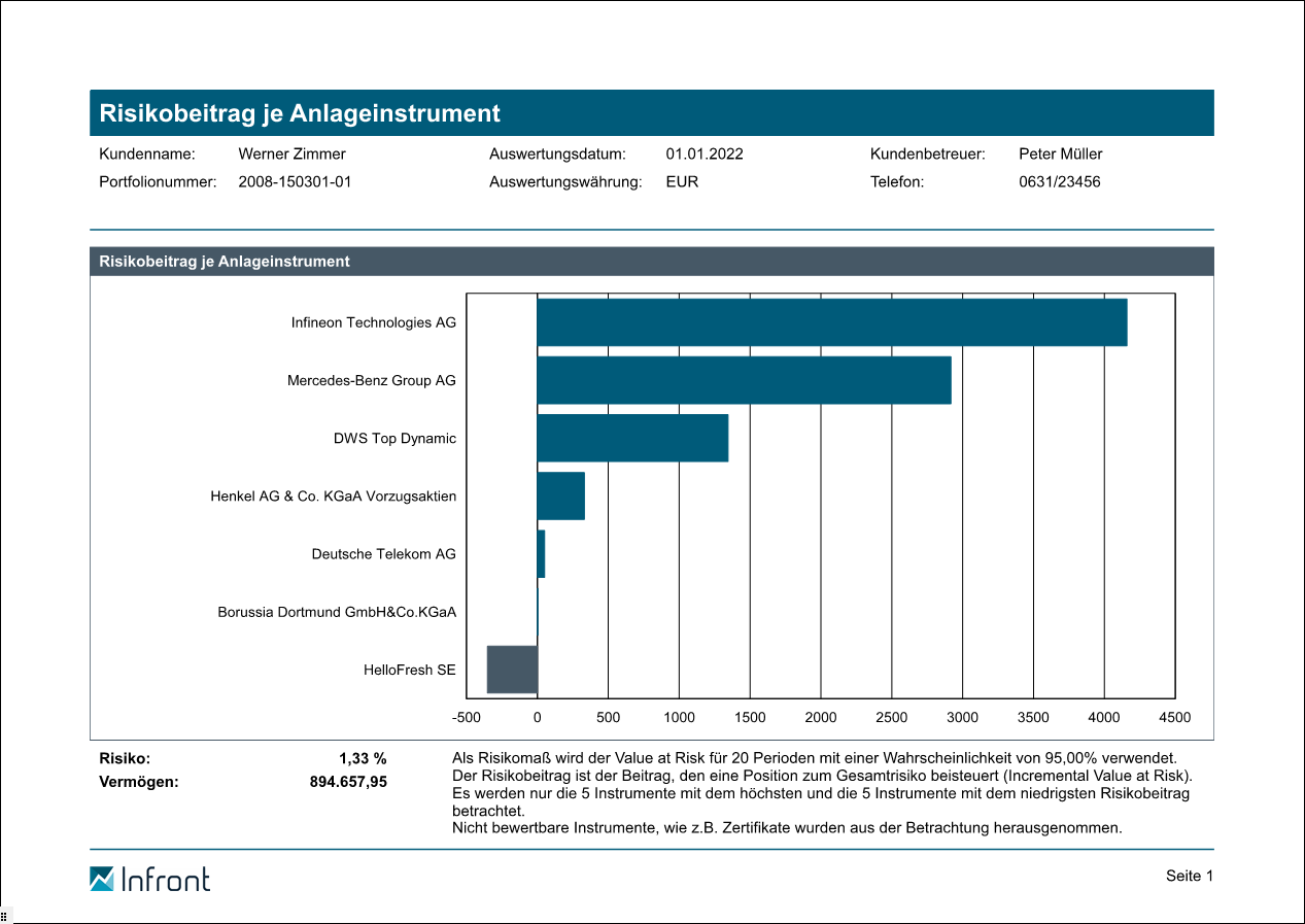 Als Risikomaß wird der Value at Risk verwendet. Der Risikobeitrag ist der Beitrag, den eine Position zum Gesamtrisiko beisteuert ("Incremental Value at Risk"). Es werden die 5 Instrumente mit dem höchsten und die 5 Instrumente mit dem niedrigsten Risikobeitrag betrachtet. Nicht bewertbare Instrumente (wie z. B. Zertifikate oder Optionsscheine) werden aus der Betrachtung herausgenommen.