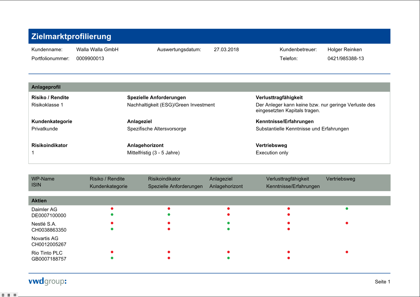 | Zielmarktabgleich | Hier finden Sie die Ergebnisse des Abgleichs der Ausprägungen der jeweiligen Zielmarktkategorie der einzelnen Wertpapiere mit denen des hinterlegten Anlageprofils. Die Tabelle der Wertpapiere ist nach Wertpapiertypen gegliedert, für jedes Wertpapier im Depot sehen Sie die folgenden Daten: