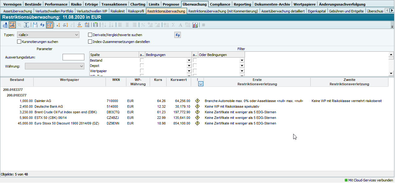 Die Restriktionsüberwachung zeigt Ihnen für alle Wertpapierpositionen pro Depot bis zu zwei ggf. verletzte Restriktionen auf. Zur Definition solcher Restriktionen lesen Sie das Kapitel Restriktionen.