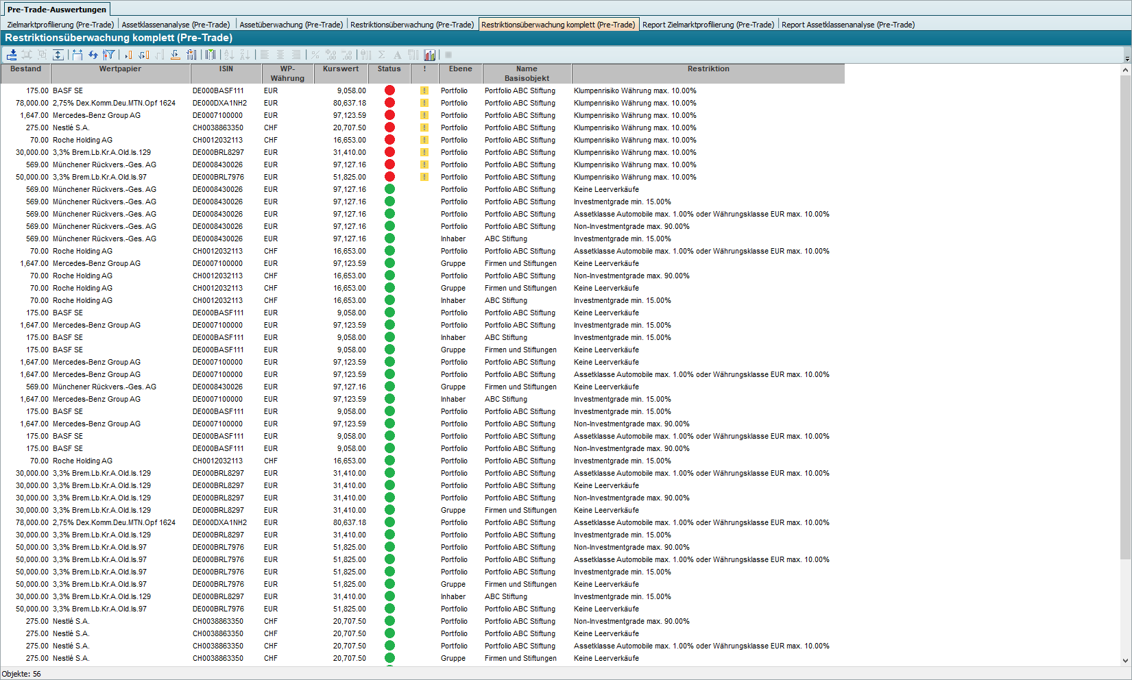 In den Pre-Trade-Auswertungen finden Sie die Auswertung "Restriktionsüberwachung komplett (Pre-Trade)", die Ihnen einen perfekten Überblick über alle betroffenen Restriktionen liefert.