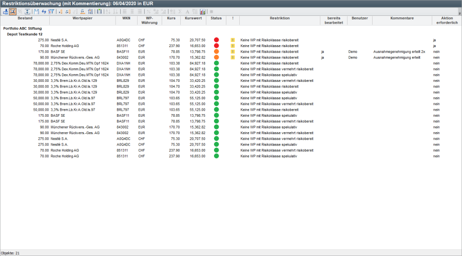 Ist kein Kommentar zum Auswertungszeitpunkt gegeben, werden die Spalten "Status geändert", "Bereits bearbeitet", "Benutzer" und "Kommentare" in der Auswertung "Restriktionsüberwachung" als leer angezeigt. Die Sortierung in diesem Fall ist zunächst nach Status ("Ampel"), anschließend nach "Aktion erforderlich" und zum Schluss nach Wertpapier/Position. Dadurch stehen Einträge oben, bei denen eine Aktion erforderlich ist.