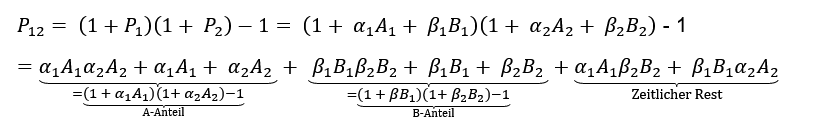 Es fällt auf, dass der A- (B-)Anteil gerade die geometrische Verknüpfung der Performancebeiträge des Segments A (B) über die beiden Perioden ist.