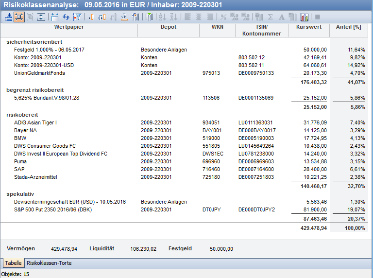 Analog zur Assetklassenanalyse ist die Risikoklassenanalyse eine tabellarische Auswertung nach Risikoklassen. Sie finden die Risikoklassenanalyse (im Auslieferungszustand) im Workspace von Portfolios, Inhabern oder Gruppen auf dem Worksheet "Vermögen".