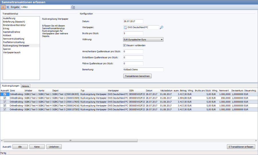 Erfassen Sie mit diesem Sammeltransaktionstyp die erhaltenen Cashflow-wirksamen Rückvergütungen für Wertpapiere über mehrere Depots.
