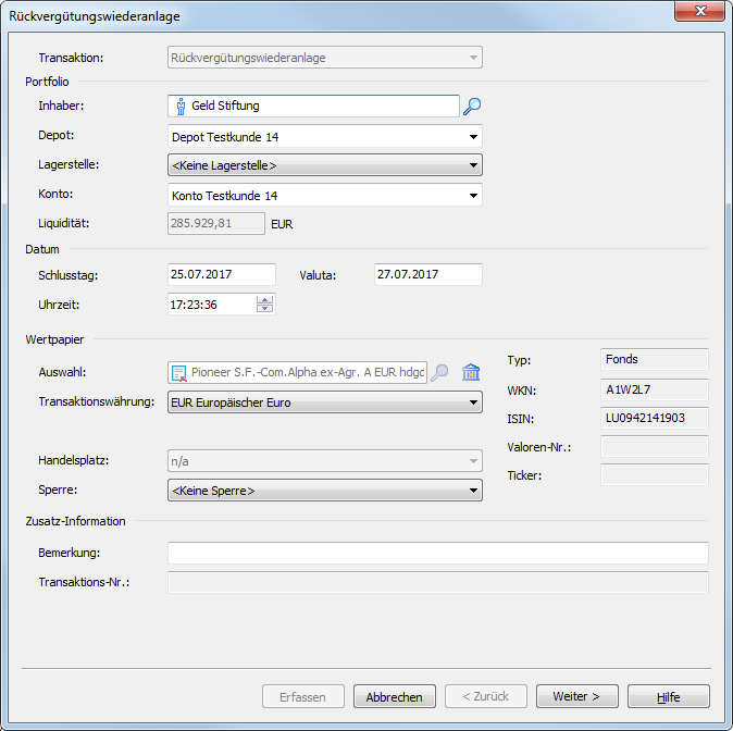 - Wählen Sie in den Depot-Transaktionstypen den Transaktionstyp RÜCKVERGÜTUNGSWIEDERANLAGE.