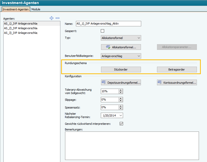 Gehen Sie wie folgt vor, um bei der Konfiguration eines Investment-Agenten ein Rundungsschema für Betragsorders zu hinterlegen: