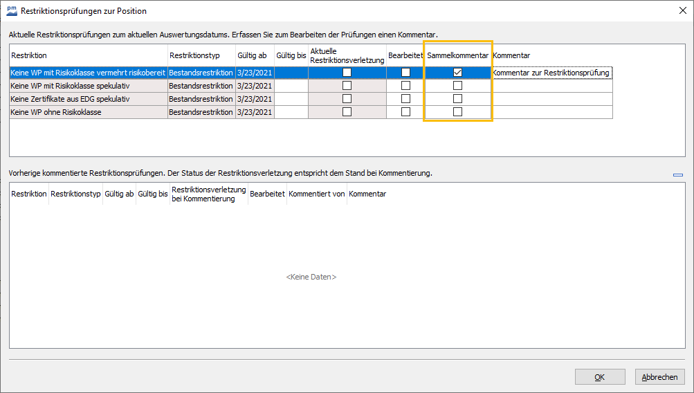 Im Dialogfenster "Restriktionsprüfungen zur Position" können Sie für einen eingegebenen Kommentar entscheiden, ob dieser für mehrere Positionen eines Portfolios gelten soll. Dazu finden Sie in der oberen Tabelle des Dialogfensters die Spalte "Sammelkommentar". Wenn Sie in dieser Spalte das Kontrollkästchen für eine Restriktion aktivieren, dann wird der Kommentar jeder Position des Portfolios mit dieser Restriktion und dem gleichen Restriktionsverletzungsstatus hinzugefügt.