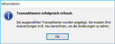 Nach erfolgter Buchung aller Transaktionen informiert Sie Infront Portfolio Manager mit einem Hinweisfenster. Um in geöffneten Auswertungen die Änderungen zu sehen, müssen Sie die Auswertungen neu auswerten.