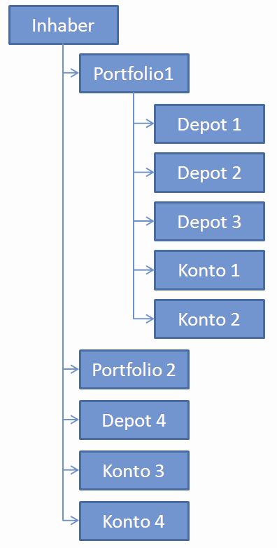 | Der Depotinhaber (Kunde). Inhaber werden überwiegend als Kunden mit Adress-Informationen und Angaben zu ihrer steuerlichen Situation aufgefasst. Die Inhaber können wiederum Depots, Konten und Portfolios besitzen. Diese können einzeln oder zusammengefasst ausgewertet werden. |
