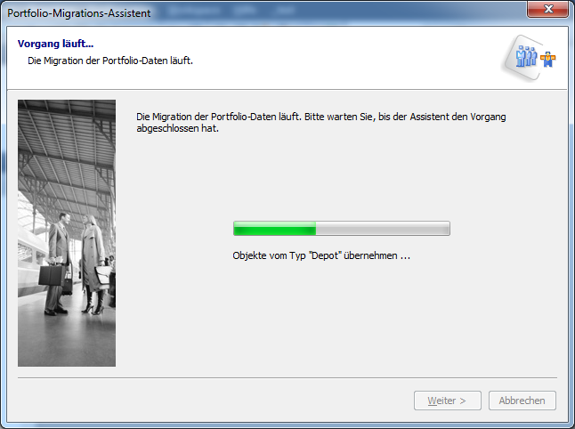 Hier läuft während der Migration ein Fortschrittsbalken. Aktuelle Hinweise informieren Sie über die Migration. Sobald diese abgeschlossen ist, erscheint die nächste Seite des Portfolio-Migrations-Assistenten.