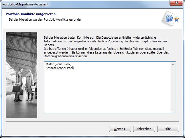 Treten bei der Migration (Portfolio-)Konflikte auf, so werden die betroffenen Inhaber hier aufgelistet und können ggf. manuell angepasst werden.